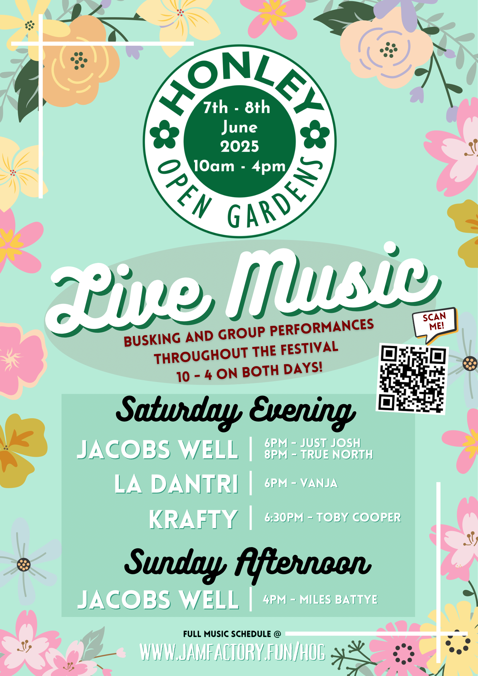 Take an inspirational tour around some of the most picturesque and diverse gadens in and around Honley from 10am - 4pm on Saturday 7th and Sunday 8th June. With buskers and bands performing in each garden throughout the festival weekend, and more live music to follow at Jacobs Well, Krafty and La Dantri on Saturday, and Jacobs Well on Sunday!